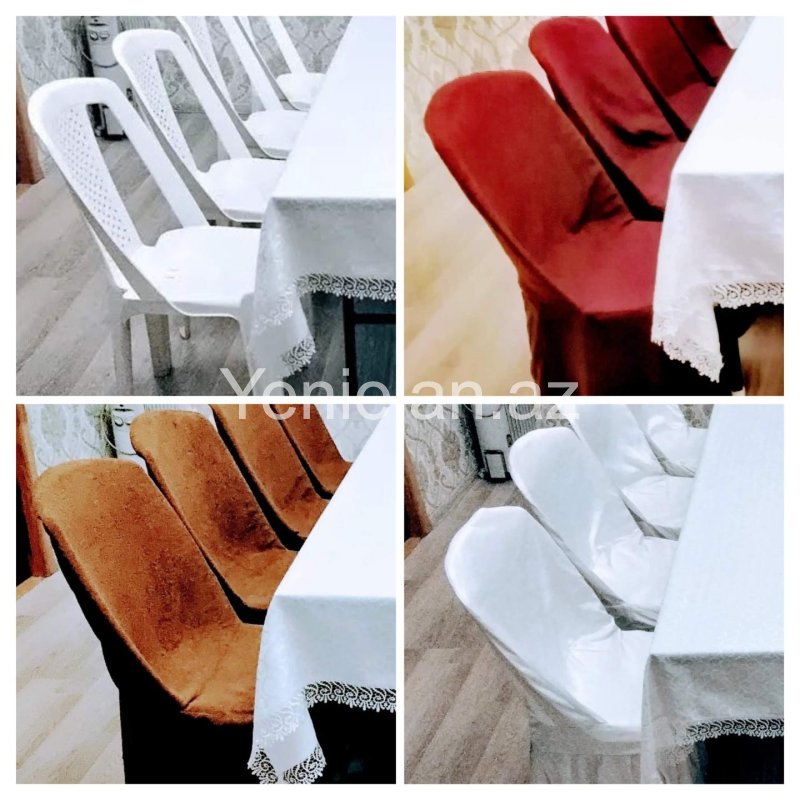 Ağ plastik stullar və parça örtüklü stul variantları.